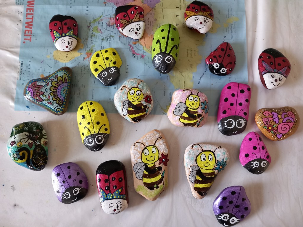 Über Facebook bin ich in vielen Steingruppen. Die größte in Deutschland ist die Gruppe Wandersteine (das Original), hier wurden schon viele Exponate von mir gepostet. Zwei sogar aus den USA, Colorado. Immer schreibt der Finder eine Botschaft im Chat, die durchweg positiv ist. Hier tauscht man sich ebenfalls aus, über Steine, Farben und Materialien, Motive usw.. Empathie und Freundlichkeit zeichnen die Unterhaltungen hier aus. Mittlerweile bin ich vielen anderen Steingruppen beigetreten, in den USA, Australien auch Österreich und die Schweiz gehören dazu. Interessant ist, dass die Tutorials, je nach Land, einen anderen Malstil haben. Man lernt immer wieder dazu! In den Kommentaren aus Amerika schrieb man mir, dass die Vorfahren aus einer kleinen Stadt am Rhein stammen. Bei diesem Post schrieben überdurchschnittlich viele Amerikaner einen Kommentar, nicht nur zu den Steine-Fotos.
