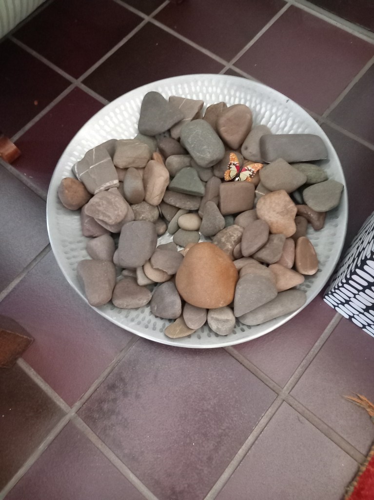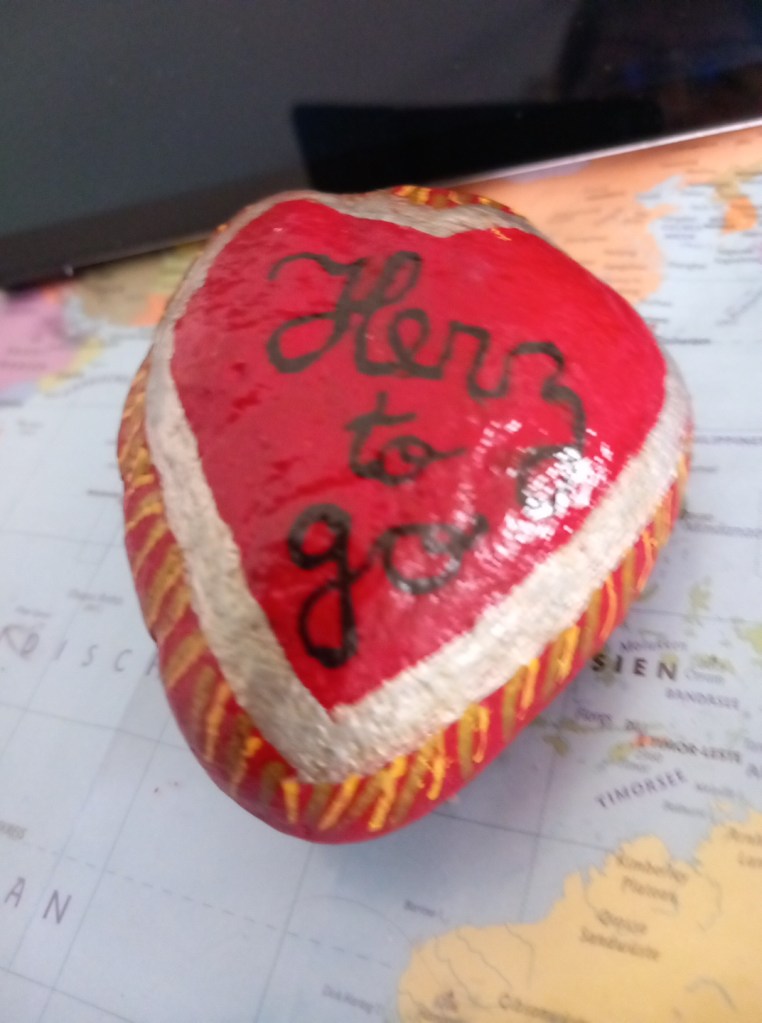 Für Freunde male ich auch Trauersteine. So malte ich für die verstorbenen Mütter meiner Freundinnen einen großen Stein mit Kirschblüten und einen Schmetterling. Eine Freundin bedankte sich bei mir und meinte dass ich wohl mit dem Malen mein Karma aufbessere. Ja, so empfinde ich es, wenn ich mal wieder einen Stein verschenke oder beobache, wenn jemand einen „Wanderstein“ findet. „